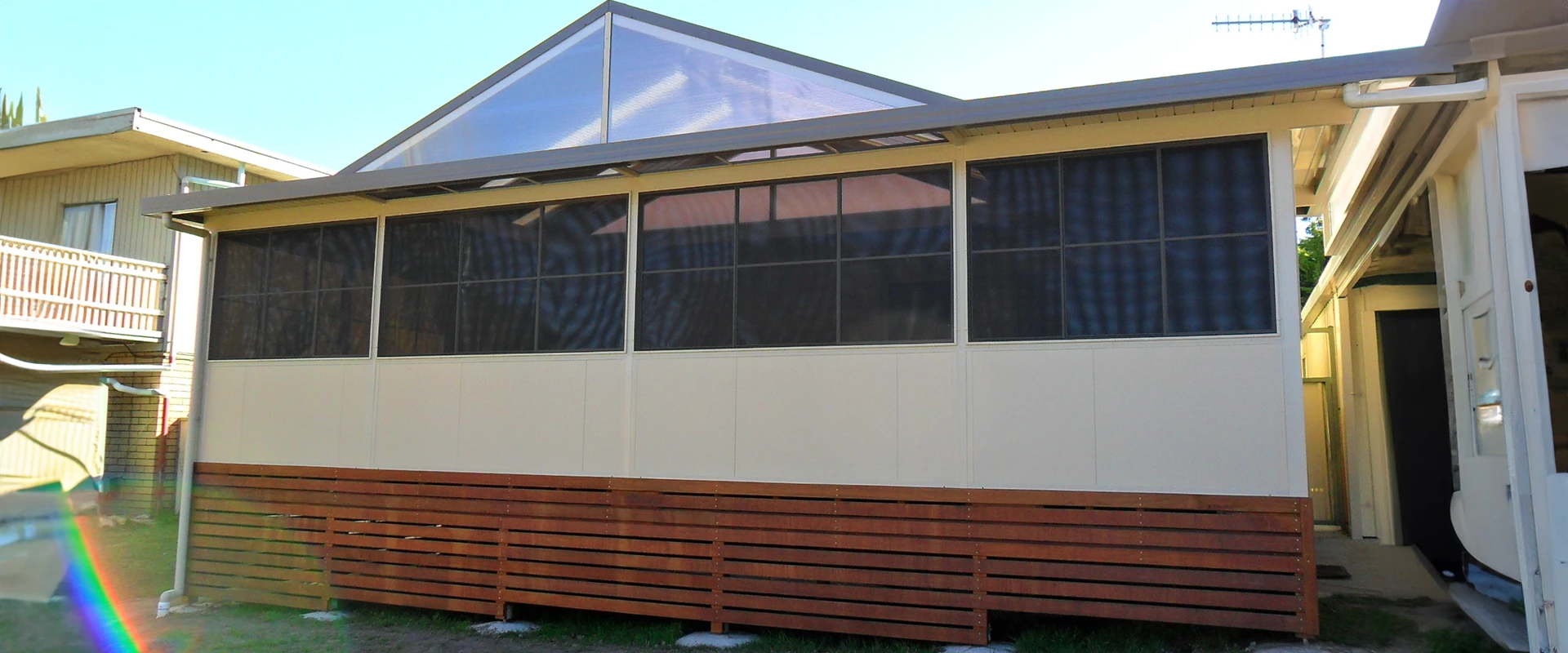 The unique Triple Sash design of the “Tri-Slide” Patio Sash Panel System offers the ability to open the windows W I D E. With a 2/3 fresh air opening and the added advantage of being able to slide all 3 sashes, you can always position the sashes to maximise the fresh air and light. For maximum ventilation the ultra-light sashes can simply be lifted out of the frames and stored away. The full, external flyscreen will keep the flies and bugs safely on the outside whilst the sashes are open or removed. When the weather turns nasty, the “Tri-Slide” Patio Sash Panel System, with its full perimeter weather sealing, will tame the wind and rain, keeping you warm and dry.